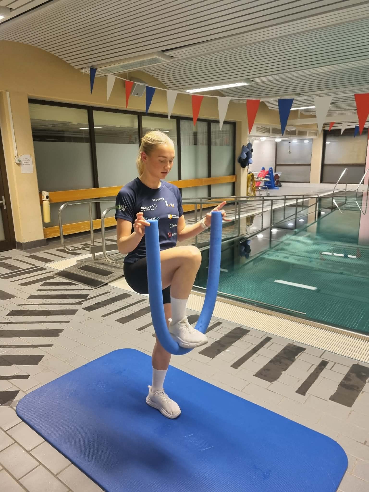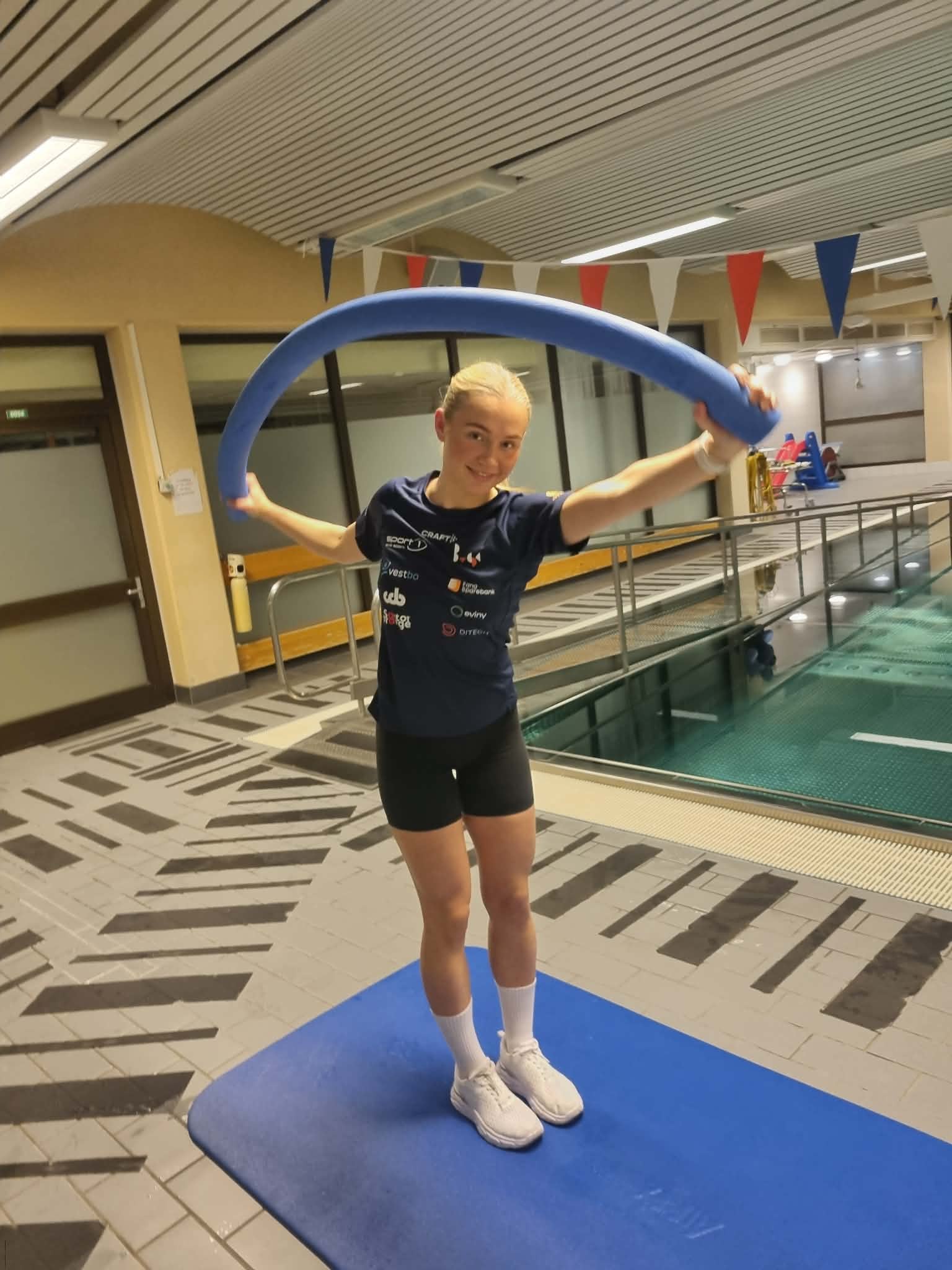 I bassenget har den første gruppen gitt applaus til hverandre og Elina for en flott gjennomført økt. Nå er det tid for neste gruppe som allerede er klare. Og på bassengkanten har Karolina Wiktoria Rajczyk gjort seg klar. Hun er også student, og blir en del av teamet vårt fremover. Karolina er spent, for dette er hennes aller første økt med gjengen, men mest av alt gleder hun seg til å spre glede og positive mestringsopplevelser.